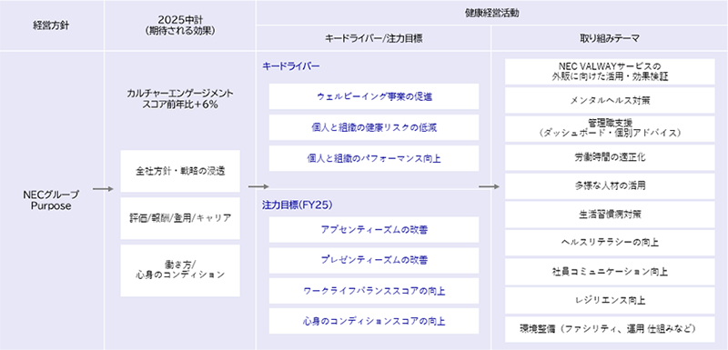 NEC VALWAYの健康経営で目指す姿・解決したい経営課題と各取り組みの関係性を整理したものが以下の戦略マップです。